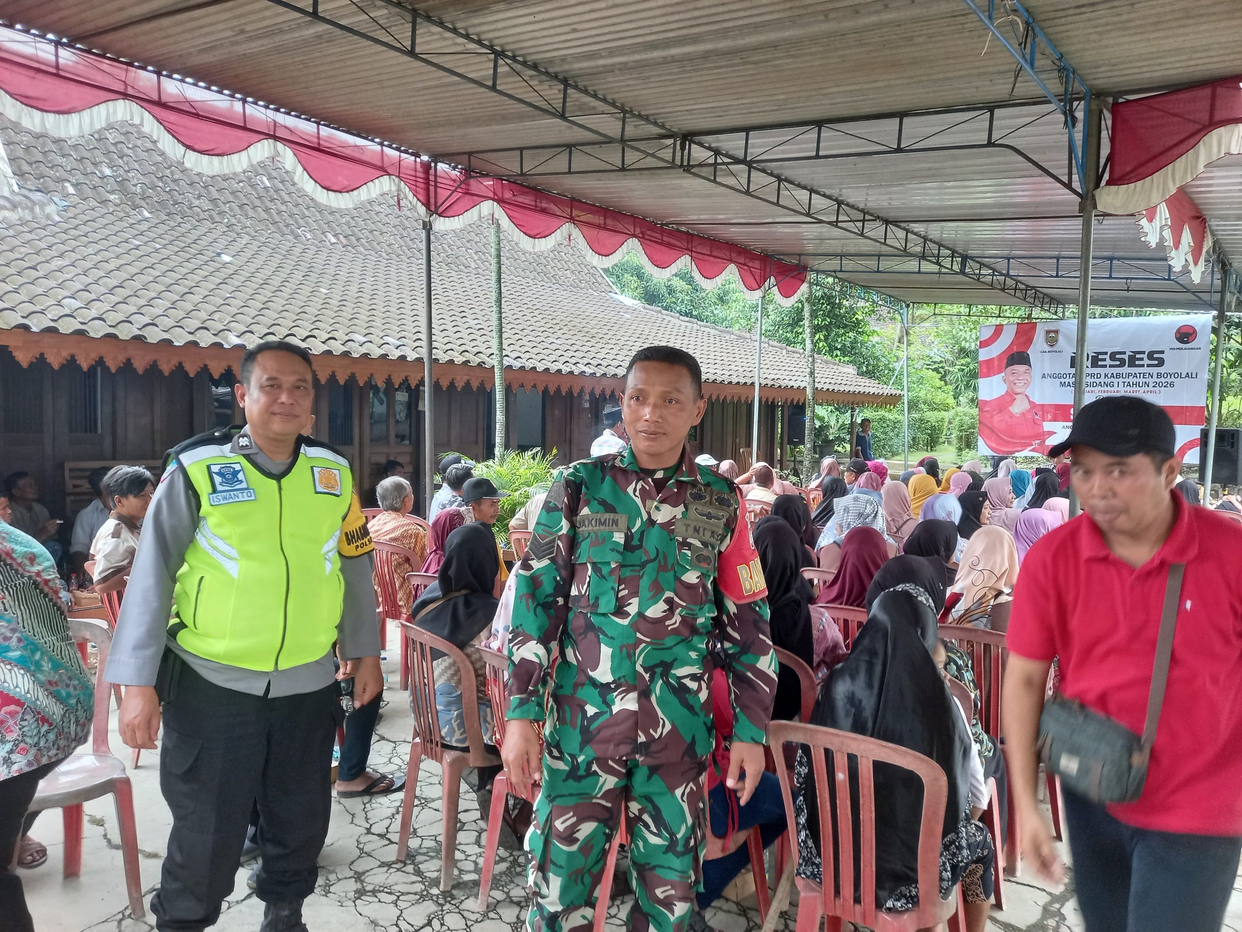 Boyolali — Babinsa Koramil 10/Sambi Kodim 0724/Boyolali, Serka Jakimin, bersama Bhabinkamtibmas Polsek Sambi menghadiri kegiatan reses Anggota Komisi 4 DPRD Kabupaten Boyolali, Bapak Suranto, S.E., yang digelar di Aula Balai Desa Jagoan, Kecamatan Sambi, Kabupaten Boyolali, Senin (19/01/2026).