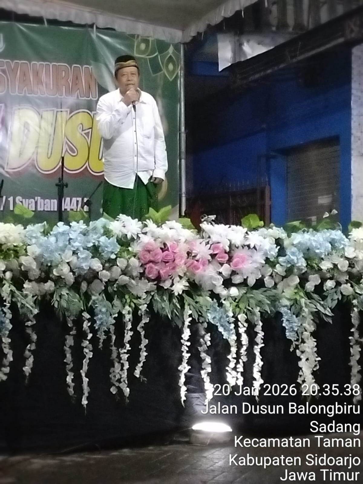 Dusun Balong Biru, Desa Sadang, Kabupaten Sidoarjo menggelar acara Malam Tasyakuran/Ruwah Dusun pada Selasa, 20 Januari 2026. Kegiatan ini dilaksanakan sebagai wujud rasa syukur kepada Allah SWT atas limpahan rahmat, keselamatan, serta kebersamaan yang selama ini dirasakan oleh seluruh warga Dusun Balong Biru dan Pemerintah Desa Sadang.