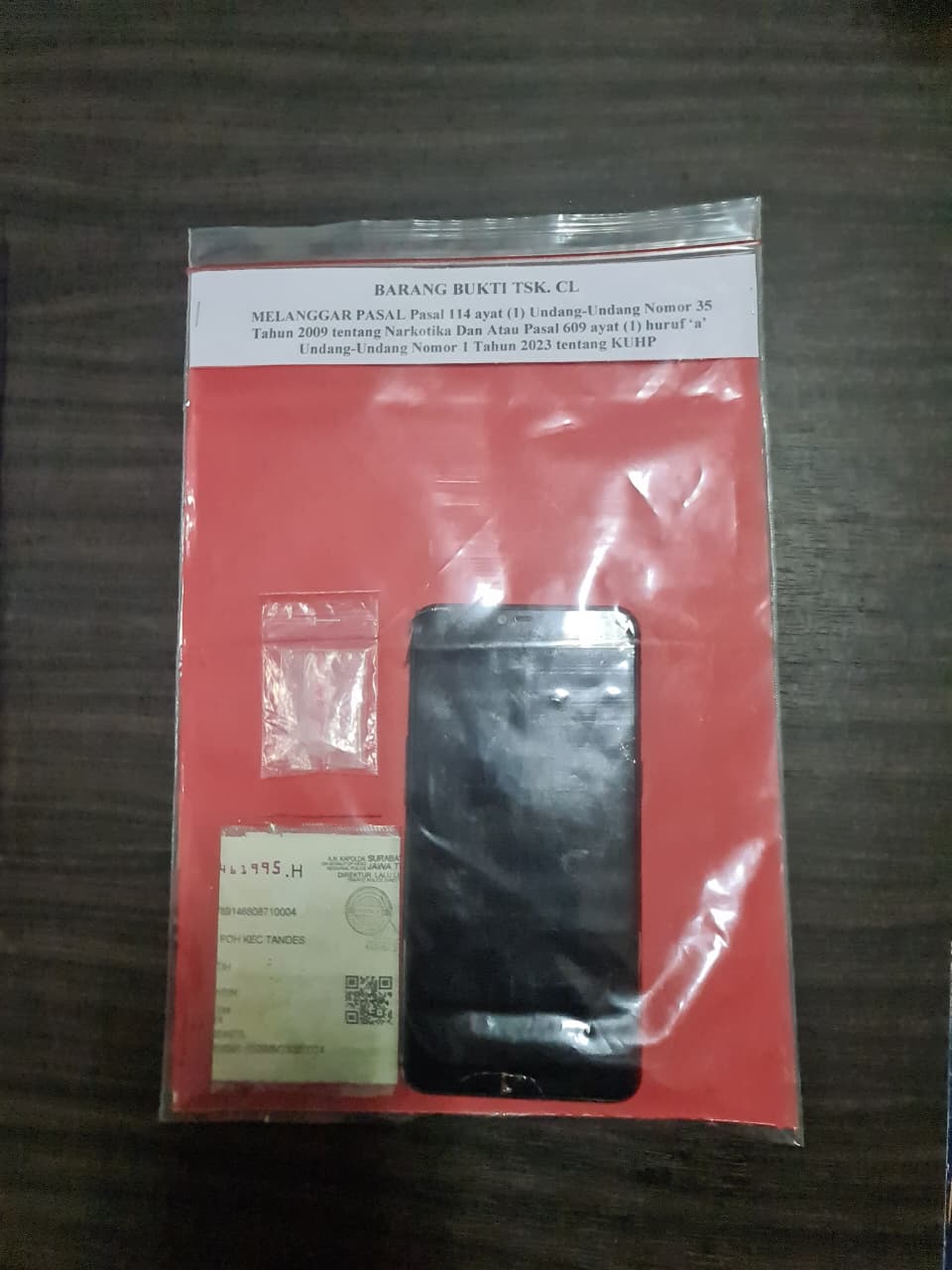 Dari hasil penggeledahan, petugas menemukan barang bukti berupa dua plastik berisi sabu dengan berat total netto sekitar 7,884 gram, Uang tunai Rp5.400.000 yang diduga hasil penjualan narkoba, Satu pak plastik klip kosong, Tas selempang, Dua unit ponsel, masing-masing iPhone 13 dan Vivo Y28, yang digunakan untuk bertransaksi.