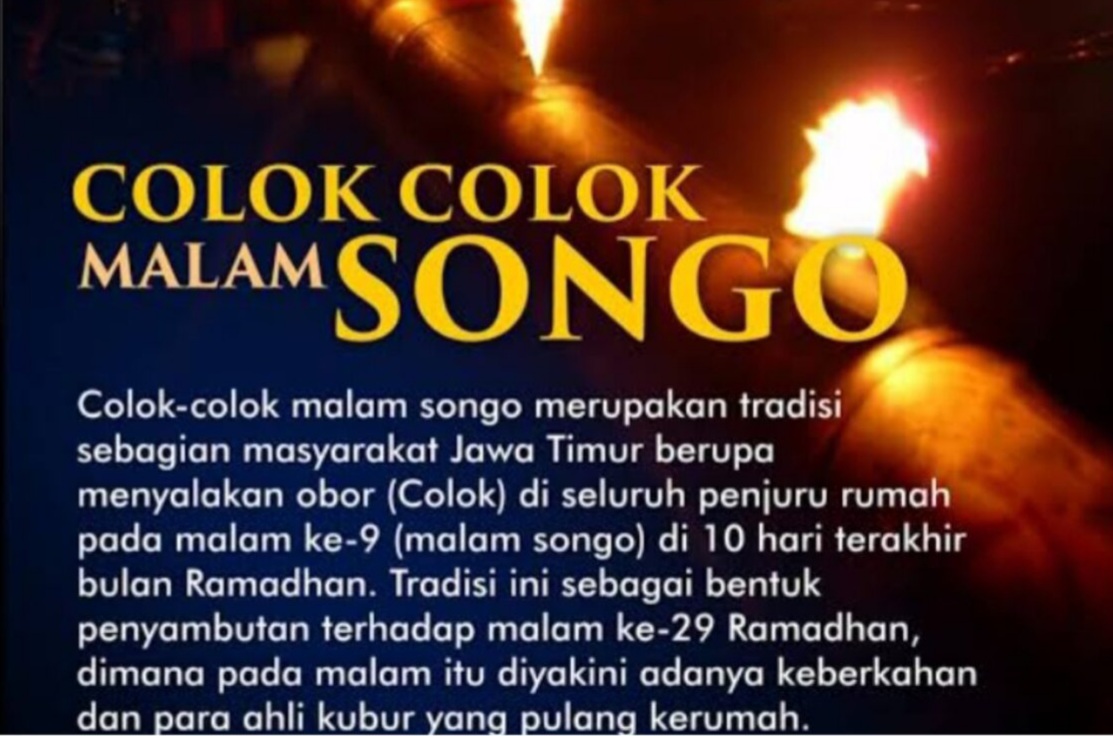 Menjelang berakhirnya bulan suci Ramadan, masyarakat di berbagai daerah di Jawa, khususnya Bojonegoro, masih melestarikan sebuah tradisi turun-temurun yang dikenal dengan sebutan Colok–colok Malam Songo. Tradisi ini dilaksanakan pada malam ke-29 Ramadan, sebagai penanda mendekatnya Hari Raya Idul Fitri yang penuh kemenangan.