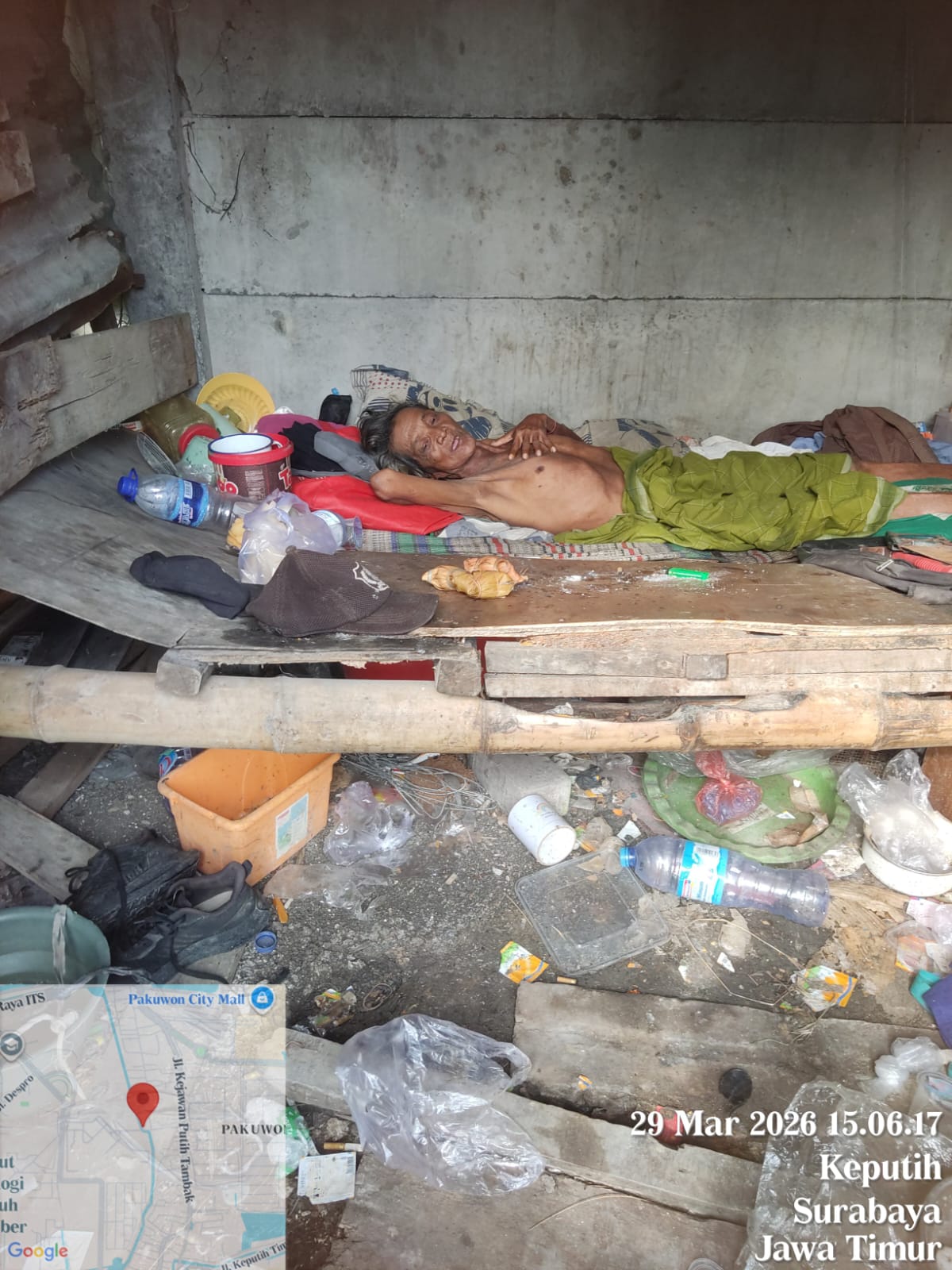 Ia tinggal di sebuah bangunan sederhana yang tidak memenuhi standar hunian layak. Dengan kondisi fisik yang semakin melemah serta keterbatasan ekonomi, pria tersebut kesulitan mencukupi kebutuhan sehari-hari, termasuk akses terhadap makanan dan layanan kesehatan.